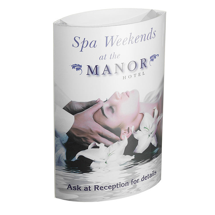 The sleek curved design ensures maximum view of the 2 A4 sheets (front and back). Useful in a wide variety of environments such as as promotional point of sale display tool on retail counters or a menu holder for coffee shops, fast food outlets, bars and restaurants.