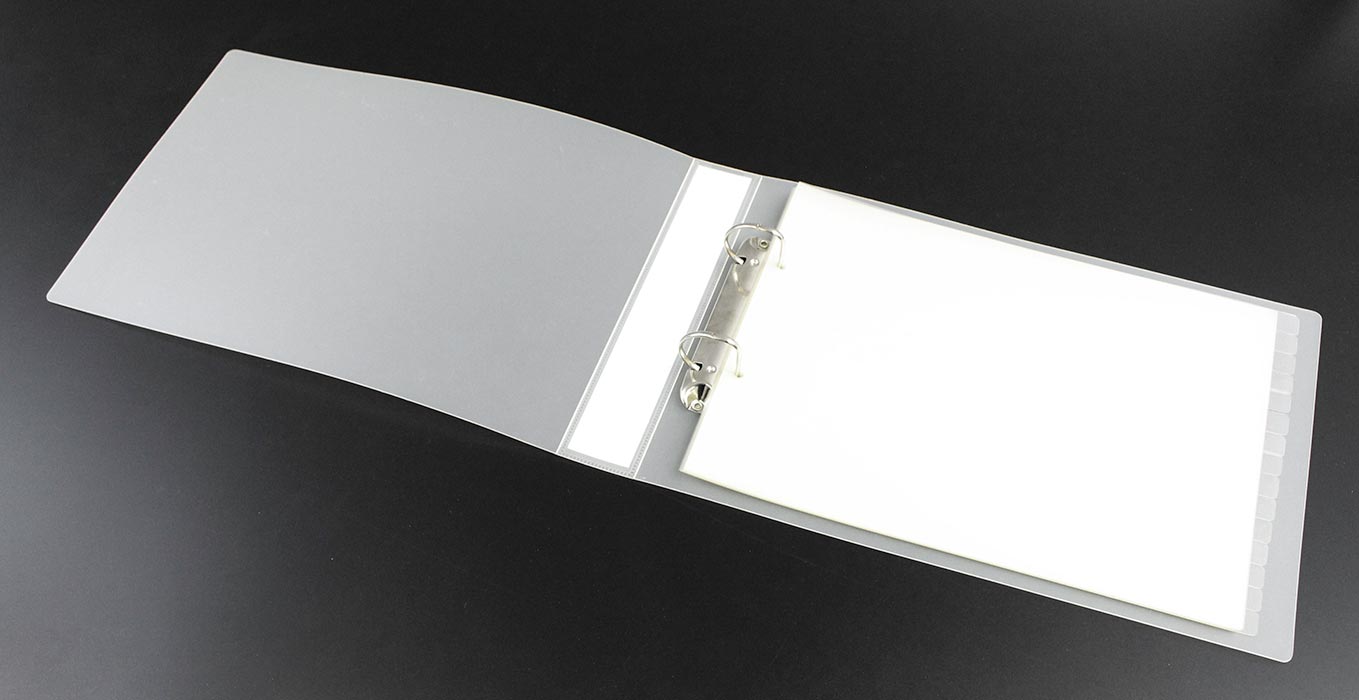 A4 landscape ring binder, made from 750 micron frosted clear. Fitted with a 30mm D ring to the back cover. Ticket pocket welded to the outside spine measuring 43 x 228mm (to take insert size 35 x 230mm).